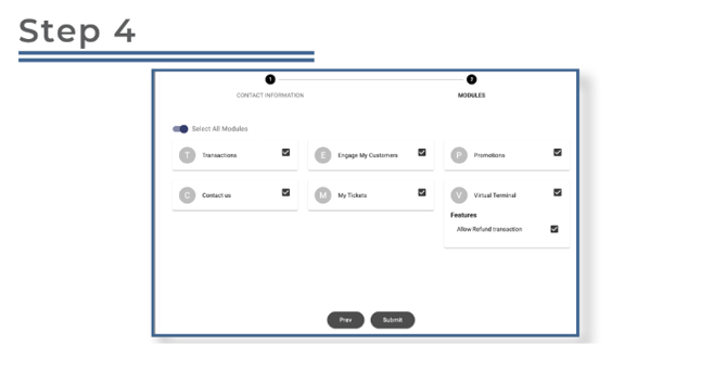 Modules typically include areas like account settings, reporting, and transaction management. -