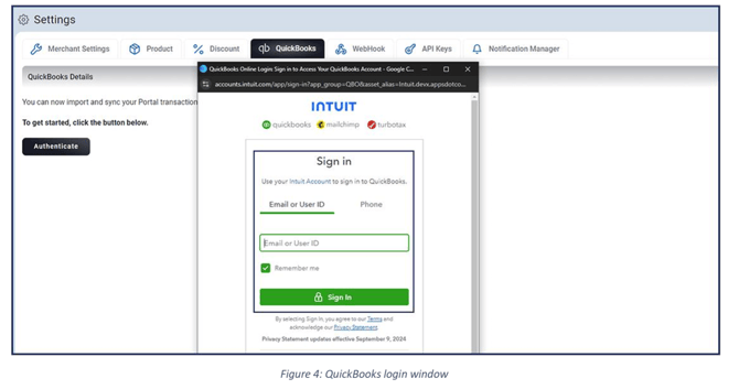 From the left navigation bar, click Settings → select the QuickBooks tab → then click Authenticate to begin the integration process.