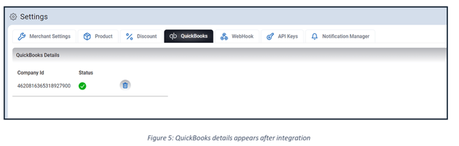 After successful login, your Customer ID and Status Confirmation will appear within a few seconds. This indicates that the QuickBooks integration is complete.