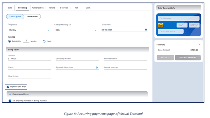 During the payment process, select the ‘Payment Sync in QB’ checkbox to sync this recurring payment with QuickBooks.